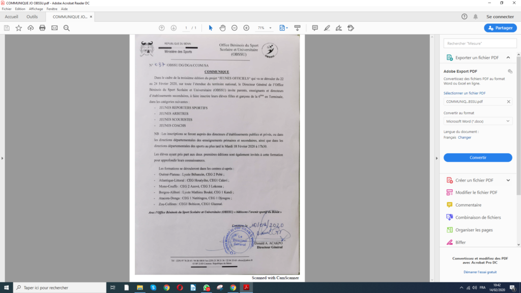 L’Office Béninois du Sport Scolaire et Universitaire (OBSSU) organise la 3e édition du projet « Jeunes Officiels » du 22 au 24 février 2020 dans tous les chef-lieux des Départements. Les inscriptions se font au niveau des directions départementales de l’enseignement secondaire et des sports et ouvertes aux élèves filles et garçons de la 6e en terminale des écoles et collèges publics et privés jusqu’au mardi 18 février 2020 à 17h30.