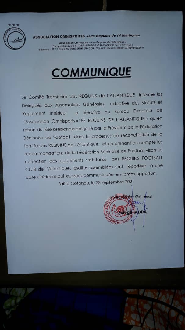 26 septembre 2021 Lire les raisons du report à travers le communiqué du secrétaire général Euloge Adda Post navigation Précédent La FBF veut outillée les différents secrétaires généraux avant le championnatSuivant Les 25 de Kim Poulsen (Tanzanie) pour affronter le Bénin Laisser un commentaire Annuler la réponseVous devez vous connecter pour publier un commentaire. Voir aussi Actualités La Une Médias et inclusion financière au Bénin Le RJCIF créé, Adam HOUETENON élu Président 12 décembre 2025 Actualités Sports CAN MAROC 2025 : les 28 Guépards retenus par Rohr ! 12 décembre 2025 Actualités La Une Politique LES MINISTRES DES AFFAIRES ÉTRANGÈRES DU NIGÉRIA ET DU BÉNIN TIENNENT UNE CONFÉRENCE DE PRESSE CONJOINTE SUR LE RÉTABLISSEMENT DE LA GOUVERNANCE DÉMOCRATIQUE AU BÉNIN ET LA SÉCURITÉ RÉGIONALE 12 décembre 2025