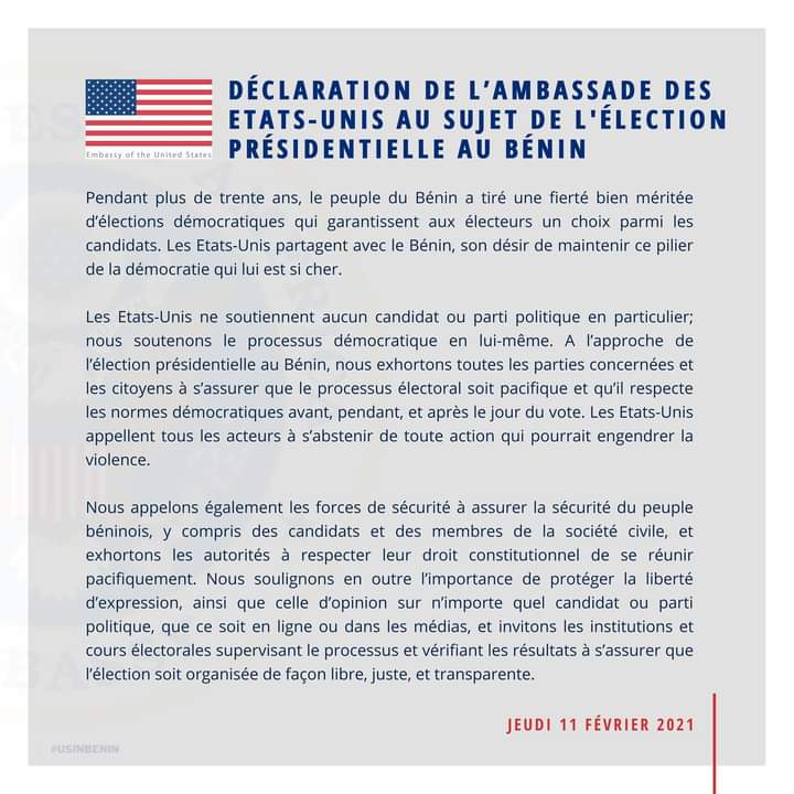 11 Février 2021 – Pendant plus de trente ans, le peuple du Bénin a tiré une fierté bien méritée d’élections démocratiques qui garantissent aux électeurs un choix parmi les candidats. Les Etats-Unis partagent avec le Bénin, son désir de maintenir ce pilier de la démocratie qui lui est si cher.