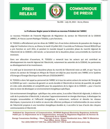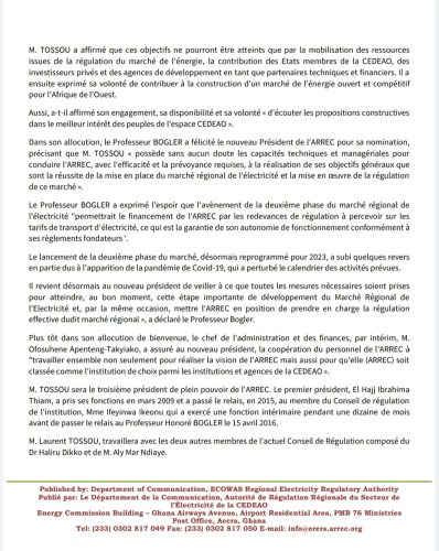 Son prédécesseur n’émet aucun doute sur ses capacités pour l’atteinte de ses objectifs. « Monsieur Tossou possède sans doute les capacités techniques et managériales pour conduire l’ARREC, avec l’efficacité et la prévoyance requises, à la réalisation de ses objectifs principaux qui sont là réussite de la mise en place du marché régional de l’électricité et la mise en œuvre de la régulation de ce marché » dixit le président sortant, le professeur Honoré Bogler dans son intervention. Le nouveau président de l’institution, Laurent Tossou peut d’ors et déjà compté sur la franche et bonne collaboration du personnel de la maison dont il a la charge pour mener à bien ses actions. En témoigne la déclaration du chef de l’administration et des finances par intérim de l’ARREC, Ofosuhene Apenteng-Takyiako. « Nous vous assurons de la coopération du personnel de l’ARREC à travailler ensemble non seulement pour réaliser la vision de l’ARREC, mais aussi pour qu’elle soit classée comme l’institution de choix parmi les institutions et agences de la CEDEAO », rassure Ofosuhene Apenteng-Takyiako.