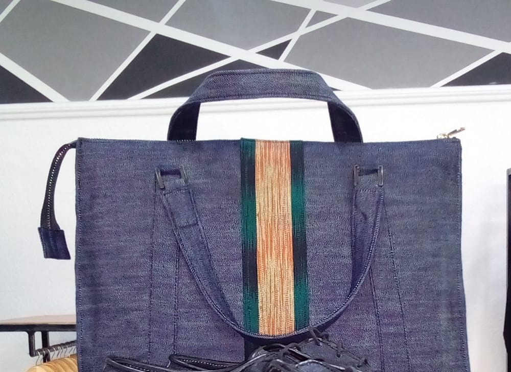 Ce sac made in Benin de couleur grise griffé de pagne tissé appelé kanvo, est cousu avec un fil de couture très solide. C’est un sac en Jean de qualité durable qui dispose d’ un espace pour garder un ordinateur portatif.