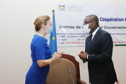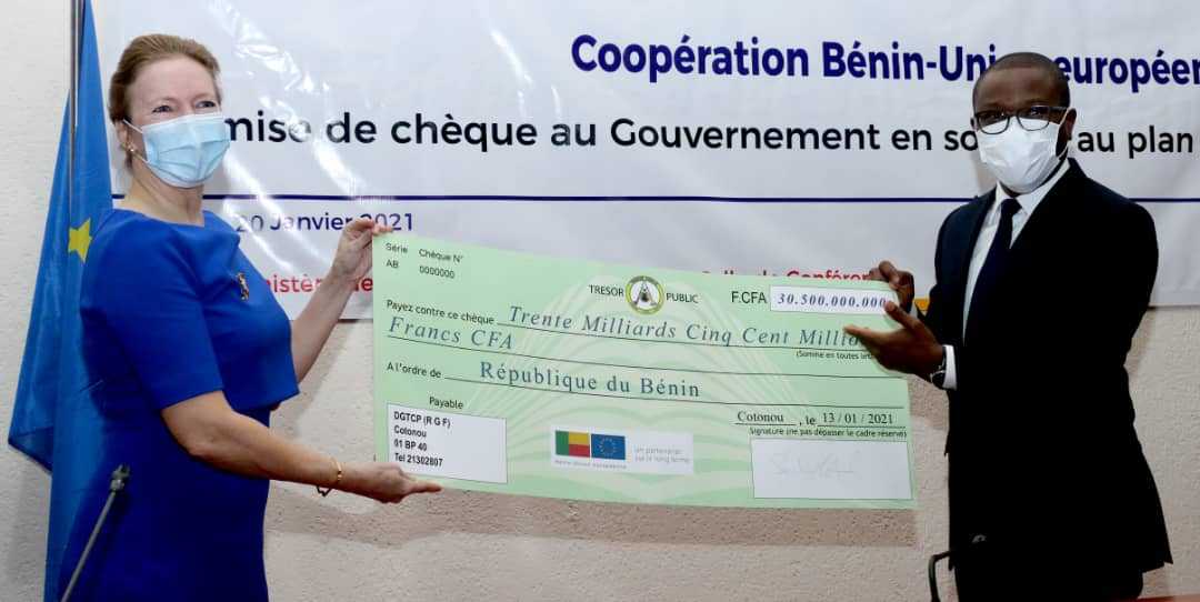 Le ministre de l’Économie et des Finances, Romuald WADAGNI, a reçu des mains de l’Ambassadrice, Cheffe de la délégation de l’Union Européenne, Sylvia HARTLEIF, un chèque de 30,5 milliards de francs CFA ce mercredi 20 janvier 2021. C’était à la faveur d’une cérémonie qui a eu pour cadre la salle de conférence du ministère.