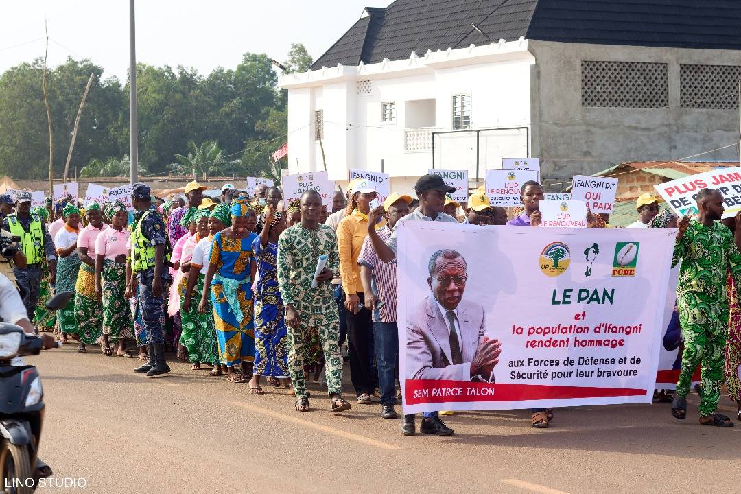 Merci à vous, populations d’Ifangni, qui avez voulu dire “Non”, et à travers les messages véhiculés par vos pancartes, montrer que vous êtes prêts à défendre la Nation quoi qu’il en coûte. Sous ce soleil, sous la chaleur, dans la sueur, vous avez bravé toutes les difficultés pour être ici et manifester votre attachement à la démocratie.