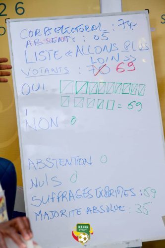 Soixante-neuf voix sur soixante-neuf voix, c’est le score obtenu par la liste «Allons plus loin» du président et candidat à sa propre succession Mathurin De Chacus pour le compte de la mandature 2022-2026 lors de l’assemblée générale élective de l’instance samedi dernier au siège de la FBF. Ainsi, devant un parterre d’invités de la Confédération Africaine de football (CAF), de l’instance suprême du football (FIFA), de plusieurs présidents de fédérations sœurs notamment celle du Togo, du Ghana, de la Côte d’Ivoire, et de plusieurs inconditionnels du cuir rond que s’est déroulé cette assemblée générale élective des membres du bureau exécutif de la fédération béninoise de football. En effet, conduite de main de maître par les membres de la commission électorale à sa tête Maître Elie Vlavonou, cette assemblée générale a été au dire des différents congressistes une fête. Et après les différents rapports d’activités du mandat 2018-2022 place a été faite à l’assemblée élective proprement dite. A ce niveau, après vérification du quorum, les différents délégués accordent pour une seconde fois leur voix au président candidat à sa propre succession Mathurin De Chacus par 69/69 voix. Heureux des différentes réformes et du calme observé lors du premier mandat de l’homme, ces délégués espèrent avoir un plus notamment avec le nouveau projet à leur présenté par le tout nouvel homme fort de la Fédération béninoise de football qui connaît la maison pour l’avoir dirigé. Prenant la parole, Mathurin De Chacus a salué les différents congressistes qui lui ont à nouveau confier les reines de la fédération béninoise de football pour un nouveau mandat de quatre ans et a profité pour leur parler des nouvelles réformes qu’il mettra en place pour le rayonnement du football béninois au cours de sa mandature. Il a profité pour faire son mea-culpa pour n’avoir pas mis sur pieds lors de son premier mandat la direction technique nationale qui est la cheville ouvrière de ce sport avant de leur faire la promesse de faire de ce vœu, un vœu pieux lors de ce second mandat. Rappelons que pour son second mandat qui porte la griffe du slogan «Allons plus loin» que deux présidents de clubs : Bruno Arthur Didavi et Gilles Comlan Gbaguidi ont fait leurs entrées au sein du comité exécutif de la FBF.