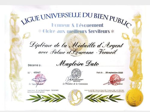 Le vendredi 29 septembre 2023 à Paris, Magloire Dato a été honoré par la Ligue universelle du bien public. Il a reçu une médaille d’argent avec palme et couronne Vermeil. Cette distinction est le fruit de nombreuses années d’engagement du récipiendaire.