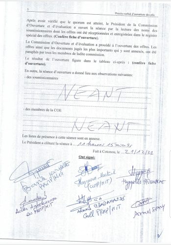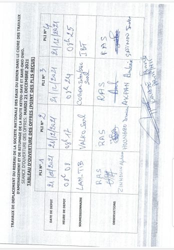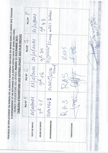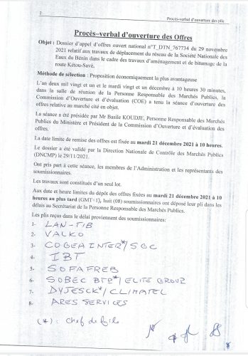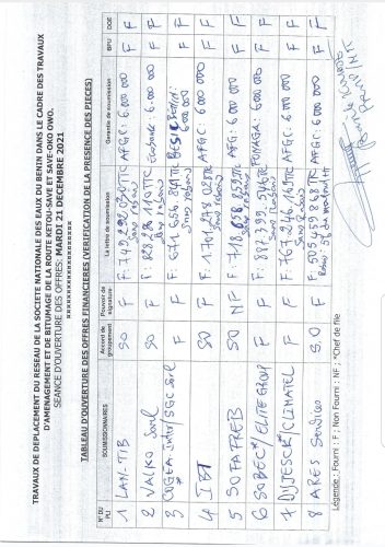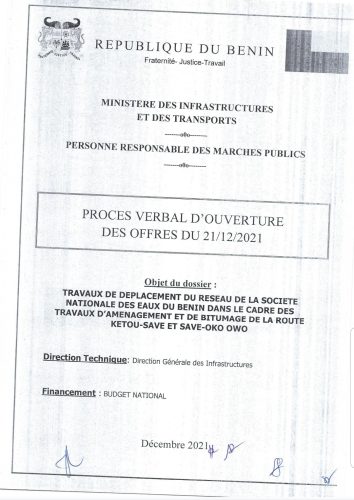 Procès verbal d'ouverture des offres du 21/12/2021 : Objet du dossier, Travaux de déplacement du réseau de la Société nationale des EAUX du Bénin (Soneb) dans le cadre des travaux d’aménagement et de bitumage de la route Kétou-Save et ET Savè-Oko Owo