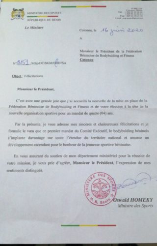 La Fédération béninoise de bodybuilding et fitness (Fbbf), élu et installée le samedi 6 juin dernier au Codiam à Cotonou, a reçu les félicitations du Ministre des sports Oswald Homeky. Cette félicitation est adressée aux membres du comité exécutif dirigée par Bienvenu Vodounou par une lettre officielle en date du mardi 16 juin 2020, .<<C’est avec une grande joie que j’ai accueilli la nouvelle de la mise en place de la Fédération béninoise de bodybuilding et fitness, et de votre élection à la tête de la nouvelle organisation sportive béninoise qui vient de naître>>, a-t-il déclaré. Tout en formulant le vœu que le bodybuilding béninois soit implanté davantage sur toute l’étendue du territoire national. Il rassure le comité élu du soutien de son département ministériel pour un accompagnement digne du nom , et l’invite à amorcer un développement ascendant du bodybuilding et du fitness pour le bonheur de la jeunesse béninoise. Rappelons que le nouveau comité exécutif de cette jeune fédération est composée de 11 membres avec à sa tête Bienvenu Vodounou qui aura la lourde mission de diriger cette fédération pendant quatre années.