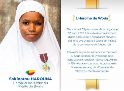 J’ai eu le plaisir et la vive émotion de recevoir au palais de la Marina ce mercredi 19 Août 2020, notre compatriote Sakinatou HAROUNA, une brave héroïne qui a sauvé 5 compatriotes lors du naufrage survenu le 3 août dernier sur le fleuve Okpara à Woria.