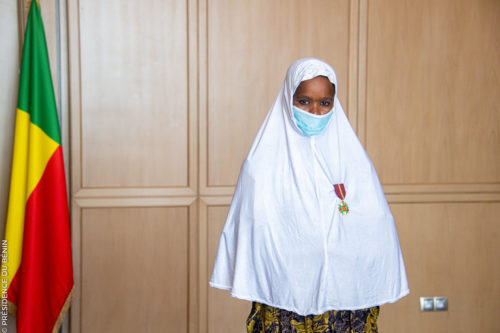 Pour récompenser et immortaliser cet acte de grande bravoure empreint d’humanisme, de patriotisme et de fierté pour la gent féminine en particulier, le Président de la République, Grand Maître de l’Ordre national du Bénin, a décidé de recevoir Madame Sakinatou HAROUNA à titre exceptionnel dans l’ordre. Ainsi, à la suite de l’audience, une cérémonie a été organisée pour nommer et élever Madame Sakinatou HAROUNA au rang de Chevalier de l’Ordre National du Mérite du Bénin. L’honneur est revenue à Madame Meba Bio Mamatou DJOSSOU, Représentante de la Grande Chancelière de l’Ordre national du Bénin, de présider cette cérémonie de décoration de l’héroïne Sakinatou HAROUNA qui entre définitivement dans l’histoire des amazones des temps modernes du Bénin. Etaient présents à l’audience et à la cérémonie de décoration, les ministres Véronique TOGNIFODE MEWANOU des Affaires sociales et de la Microfinance, Sacca LAFIA de l’intérieur, Alimatou Shadiya ASSOUMAN de l’Industrie et du Commerce ainsi que les parents de la récipiendaire.