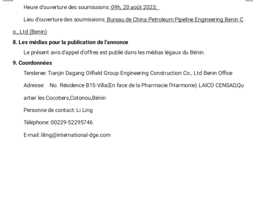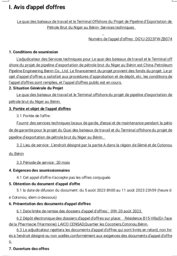 Le quai des bateaux de travail et le Terminal Offshore du Projet de Pipeline d’Exportation de Pétrole Brut du Niger au Bénin: Avis d’appel d’offres
