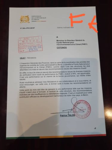 En effet dans une lettre adressée au Directeur Général du FNEC Appolinaire D. GNANVI, le 20 août 2020, le Président Patrice TALON reconnaît les efforts de bonne gouvernance de toute l’équipe du Fonds National pour l’Environnement et le Climat ( FNEC).