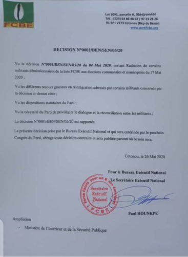 26 mai 2020 Les membres FCBE radiés sont à nouveau réintégrer par le bureau politique conduite par le SEN Paul HOUNKPE Post navigation Précédent La Une du Lundi 25 Mai 2020Suivant 34 nouveaux cas guéris Laisser un commentaire Annuler la réponseVous devez vous connecter pour publier un commentaire. Voir aussi Actualités La Une Médias et inclusion financière au Bénin Le RJCIF créé, Adam HOUETENON élu Président 12 décembre 2025 Actualités Sports CAN MAROC 2025 : les 28 Guépards retenus par Rohr ! 12 décembre 2025 Actualités La Une Politique LES MINISTRES DES AFFAIRES ÉTRANGÈRES DU NIGÉRIA ET DU BÉNIN TIENNENT UNE CONFÉRENCE DE PRESSE CONJOINTE SUR LE RÉTABLISSEMENT DE LA GOUVERNANCE DÉMOCRATIQUE AU BÉNIN ET LA SÉCURITÉ RÉGIONALE 12 décembre 2025