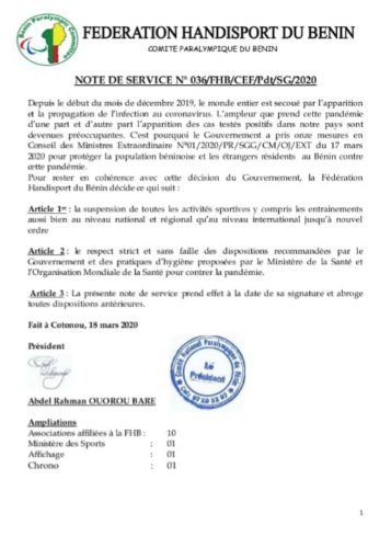A travers un communiqué en date du 18 mars 2020, la Fédération Béninoise de Handisport suspend toutes les compétitions nationales et ce, pour deux semaines comme l’a indiqué le gouvernement. Cette disposition a été prise en accord avec les mesures prises par le gouvernement contre la pandémie de coronavirus qui sévit dans le monde. En prenant cette décision, le président de la Fédération béninoise de Handisport veut protéger ces athlètes de ce mal.