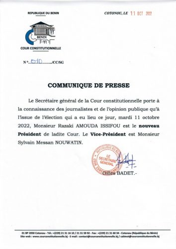 (Lire le communiqué du secrétaire général de la Cour constitutionnelle, Mr Gilles BADET )
