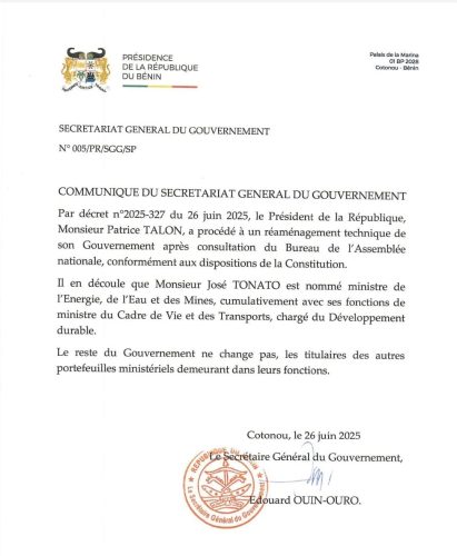 Par décret N°2025-327 du 26 juin 2025, le Président de la République, Monsieur Patrice TALON, a procédé à un réaménagement technique de son Gouvernement après consultation du Bureau de l’Assemblée nationale, conformément aux dispositions de la Constitution.