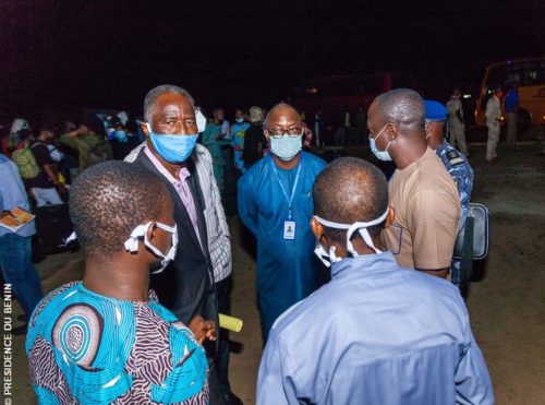 Dans la nuit du 22 au 23 mai 2020, une délégation du ministère de la Santé, conduite par le Directeur Départemental de la Santé du Mono, le Docteur Étienne HOUNKONNOU, a accueilli un groupe de 100 béninois conduits à la frontière de Hillacondji par l’armée ghanéenne. Ces compatriotes, qui sont pour la plupart victimes d’arnaque au Ghana, ont été interceptés dans les rues par la Police ghanéenne pendant la période du confinement décrétée par les autorités de ce pays pour lutter contre la propagation du Coronavirus car, n’ayant pas de domiciles fixes.