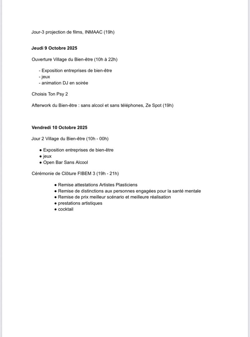 Au programme, des résidences artistiques (arts plastiques, théâtre) ; des expositions et vernissages ; des projections de films liés à la santé mentale ; des conférences et panels avec les professionnels de la santé mentale ; un village du bien-être (stands , associations et animations) ; des concerts et moments culturels ; des visites de structures de soins ; des consultations de Psys et bien d’autres activités. Notons toutes les activités seront gratuites, mais une plateforme est en cours de développement pour permettre aux participants de s’inscrire.