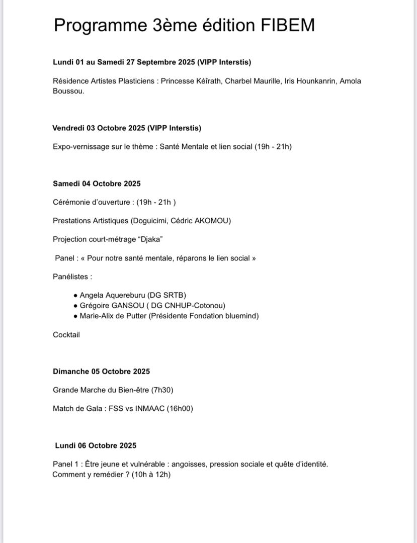 Notons que le Festival International du bien-être mental, ce sont 2 éditions organisées avec succès ; plus de 1000 participations cumulés lors des deux premières éditions ; des partenariats locaux et internationaux avec des ONG , établissements scolaires et professionnels de santé ; plus de 50 artistes impliqués ; des couvertures médiatiques par les radios, presses locales et médias sociaux ; un taux de satisfaction > 90% auprès des publics touchés et des partenaires engagés comme VIPP Interstis ; M. Crédo Gansou ; la DG de la SRTB qui nous accompagne pour cette édition et biens d’autres.