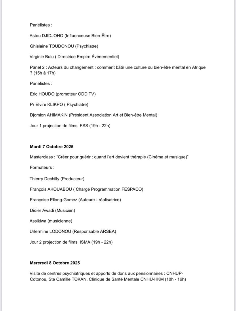 Au programme, des résidences artistiques (arts plastiques, théâtre) ; des expositions et vernissages ; des projections de films liés à la santé mentale ; des conférences et panels avec les professionnels de la santé mentale ; un village du bien-être (stands , associations et animations) ; des concerts et moments culturels ; des visites de structures de soins ; des consultations de Psys et bien d’autres activités. Notons toutes les activités seront gratuites, mais une plateforme est en cours de développement pour permettre aux participants de s’inscrire.