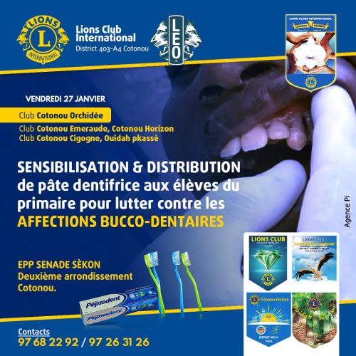 Ce vendredi 27 Janvier 2023, s’est déroulé à l’EPP Senade Sèkon dans le 2ième arrondissement de cotonou, une séance de sensibilisation et de distribution de 100 colis de pâte dentifrice aux élèves du primaire pour lutter contre les affections bucco-dentaires par le Lions Clubs International à travers plusieurs clubs de la zone 13 et de la zone 15.