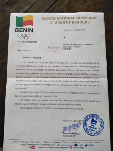Fédération Béninoise de Handball qui s’est déroulé le 25 septembre 2021 à Porto-Novo et vous en remercie. Je note avec satisfaction que la famille du handball du Bénin a porté son choix sur un de ses