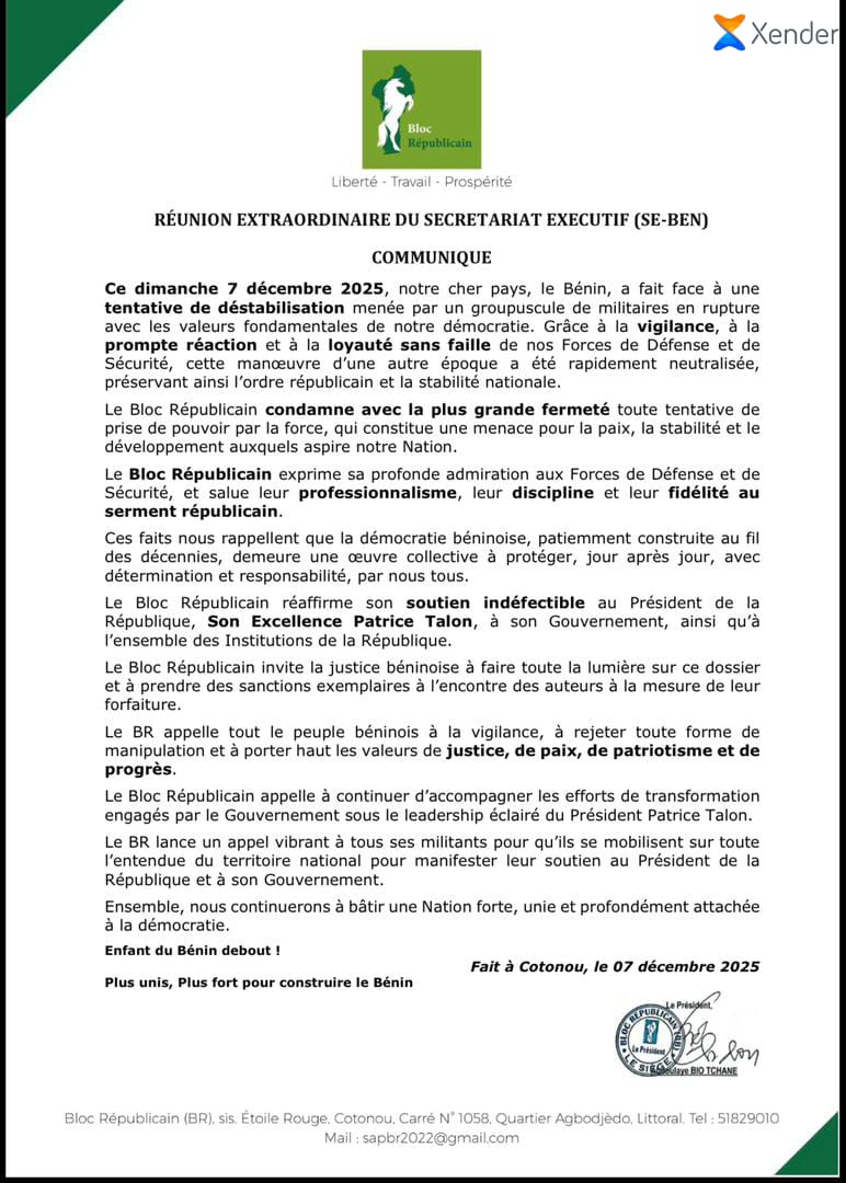 7 décembre 2025 COMMUNIQUÉ UP LE RENOUVEAU - 071225 Post navigation Précédent Coup d’État avorté au Bénin : l’UA réaffirme son soutien au président Patrice Talon et à l’ordre constitutionnelSuivant Conseil des Ministres extraordinaire du 08 – 12-2025 : la tentative de coup d’Etat au coeur des discussions ! Voir aussi Actualités La Une INSTALLATION DES MEMBRES DE L’UPMB : Hervé Hessou prend officiellement les commandes 9 décembre 2025 Actualités La Une INSTALLATION DES MEMBRES DE L’UPMB (2025-2028) : le discours fédérateur du nouveau Président, Hervé Prudence HESSOU ! 9 décembre 2025 Actualités La Une Sports TROISIEME ÉDITION DU GÉANT FITNESS : un pari réussi pour Special Olympics Bénin ! 9 décembre 2025