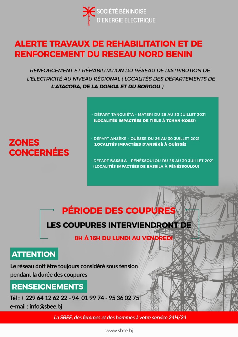 – Renforcement et réhabilitation du réseau de Distribution de l’électricité au niveau Régional (Localités des Départements de L’ ATACORA, de la DONGA et du BORGOU)