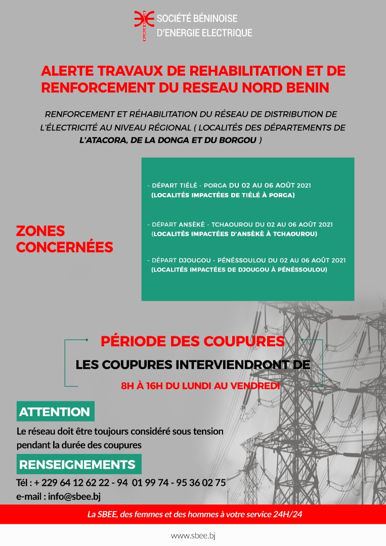 – Renforcement et réhabilitation du réseau de Distribution de l’électricité au niveau Régional (Localités des Départements de L’ ATACORA, de la DONGA et du BORGOU)