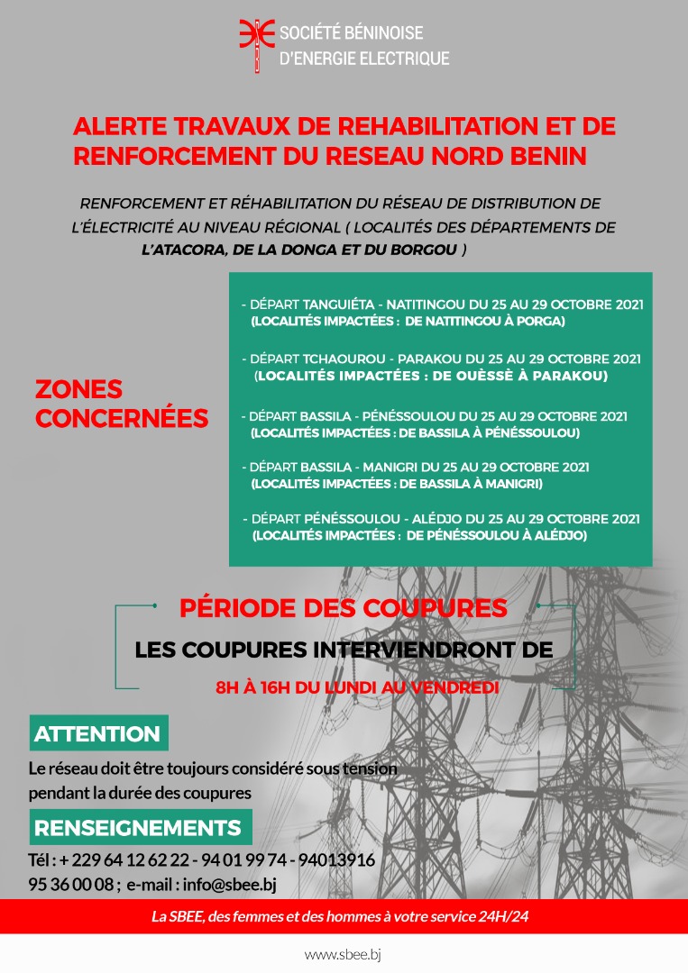 DANS LE CADRE DE LA RÉALISATION DES TRAVAUX DE RÉHABILITATION ET DU RENFORCEMENT DU RÉSEAU NORD BENIN, LA SOCIÉTÉ BÉNINOISE D’ÉNERGIE ÉLECTRONIQUE (SBEE) PORTE À CONNAISSANCE DE SON AIMABLE CLIENTÈLE DES RÉGIONS CONCERNÉES LE PROGRAMME ALLANT DU LUNDI 25 AU 29 OCTOBRE 2021.