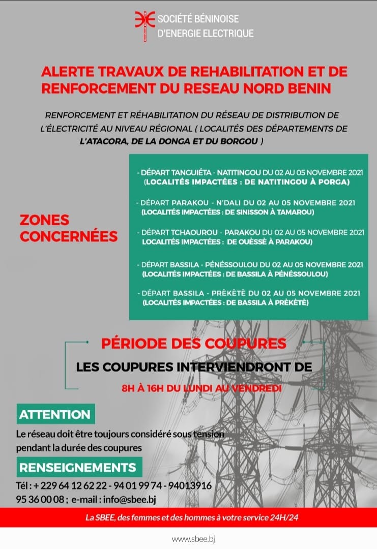 – Renforcement et réhabilitation du réseau de Distribution de l’électricité au niveau Régional (Localités des Départements de L’ATACORA, de la DONGA et du BORGOU)