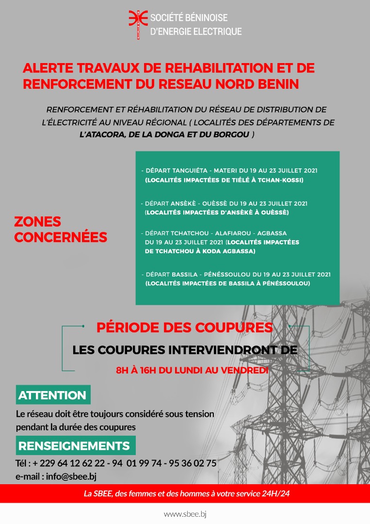 – Renforcement et réhabilitation du réseau de Distribution de l’électricité au niveau Régional (Localités des Départements de L’ ATACORA, de la DONGA et du BORGOU)
