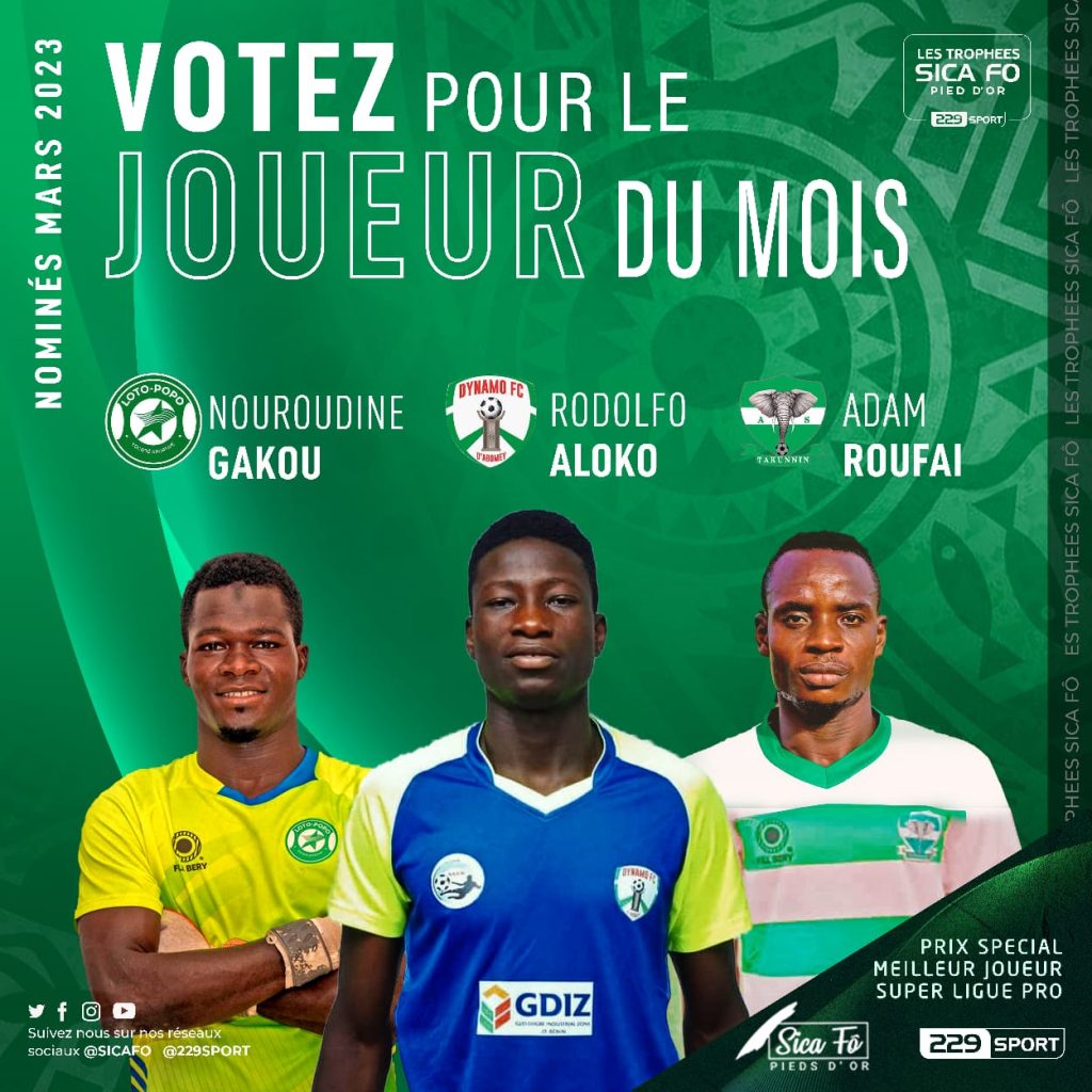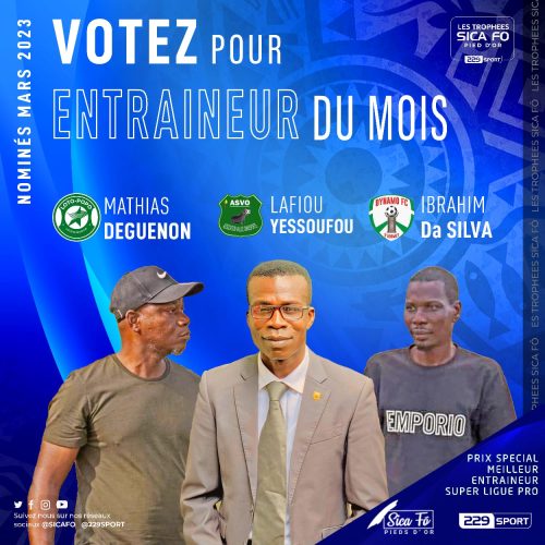 Du côté des entraîneurs, les nominés sont Mathias Deguenon du LOTO POPO, Lafiou Yessoufou de l’ASVO et Ibrahim Da Silva du DYNAMO FC. Ces entraîneurs ce sont notamment distingués durant le mois de mars à travers les bons résultats de leur club.