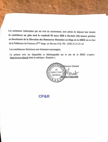 Les personnes intéressées par cet avis de recrutement, sont priées de déposer leur dossier de candidature au plus tard le vendredi 06 Mars 2020 à dix-huit heures 18 heures précises au secrétariat de la Direction des ressources Humaines au siège de la SBEE, sis en face de la préfecture de Cotonou 3ème étages, Bureau (313) tel : +229 21312145