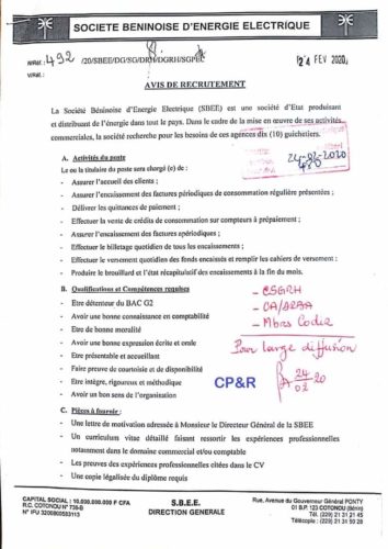 La société Béninoise d’Energie Electrique SBEE est une société d’Etat produisant et distribuant de l’énergie dans tout le pays. Dans le cadre de la mise en œuvre de ses activités commerciales, la société recherche pour les besoins de ces agences dix 10 guichetiers.