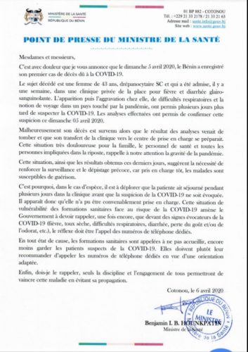 Communiqué du Ministre de la santé au sujet du premier décès lié au Covid-19 au Bénin