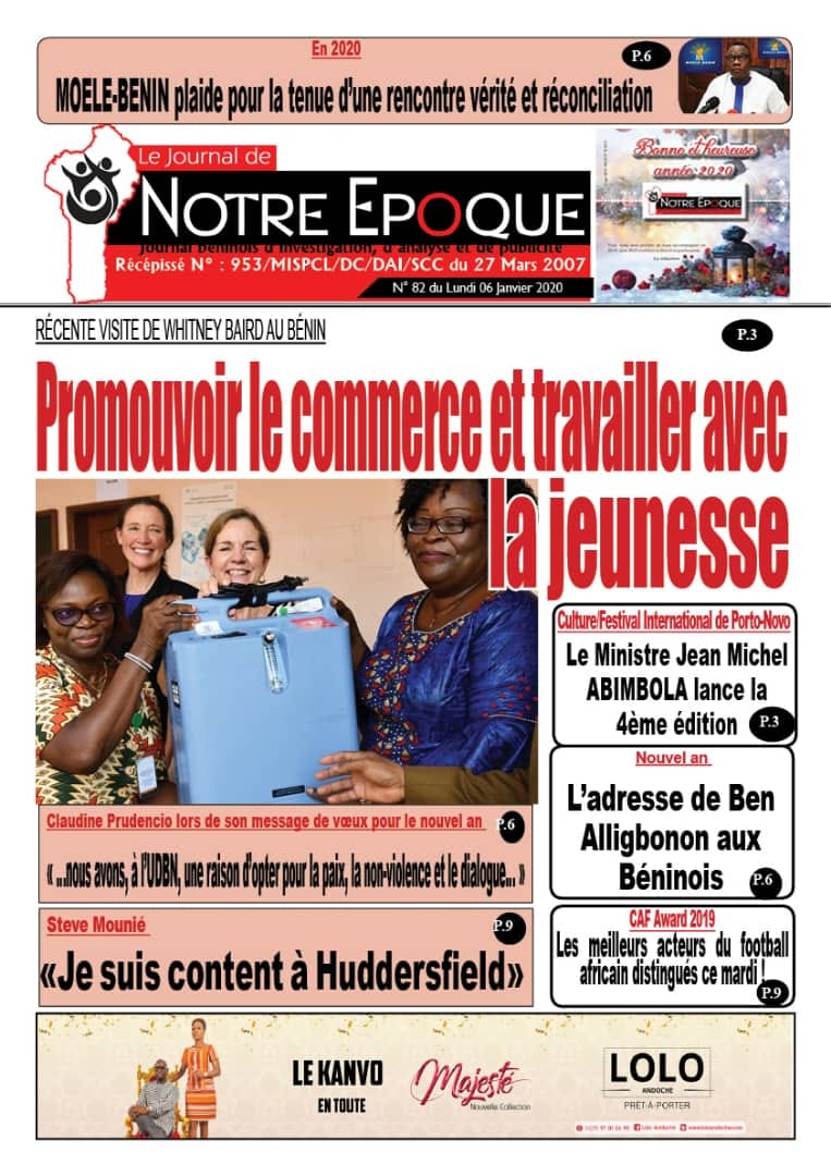 6 janvier 2020 [download id= »2274″] Tags: La Une Post navigation Précédent La Une du 3 janvier 2020Suivant Lolo Andoche primé à Abidjan Laisser un commentaire Annuler la réponseVous devez vous connecter pour publier un commentaire. Voir aussi Actualités La Une Médias et inclusion financière au Bénin Le RJCIF créé, Adam HOUETENON élu Président 12 décembre 2025 Actualités La Une Politique LES MINISTRES DES AFFAIRES ÉTRANGÈRES DU NIGÉRIA ET DU BÉNIN TIENNENT UNE CONFÉRENCE DE PRESSE CONJOINTE SUR LE RÉTABLISSEMENT DE LA GOUVERNANCE DÉMOCRATIQUE AU BÉNIN ET LA SÉCURITÉ RÉGIONALE 12 décembre 2025 Actualités La Une JIV 2025 : L’AnpE et la PNOVEJ célèbrent les volontaires sous le signe de l’engagement citoyen 12 décembre 2025