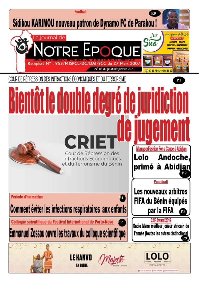 9 janvier 2020 [download id= »2271″] Tags: La Une Post navigation Précédent Espoirs, Requins opposé à Cavaliers, les matchs de la treizième journée.Suivant Emmanuel Zossou ouvre les travaux du colloque scientifique Laisser un commentaire Annuler la réponseVous devez vous connecter pour publier un commentaire. Voir aussi Actualités La Une Médias et inclusion financière au Bénin Le RJCIF créé, Adam HOUETENON élu Président 12 décembre 2025 Actualités La Une Politique LES MINISTRES DES AFFAIRES ÉTRANGÈRES DU NIGÉRIA ET DU BÉNIN TIENNENT UNE CONFÉRENCE DE PRESSE CONJOINTE SUR LE RÉTABLISSEMENT DE LA GOUVERNANCE DÉMOCRATIQUE AU BÉNIN ET LA SÉCURITÉ RÉGIONALE 12 décembre 2025 Actualités La Une JIV 2025 : L’AnpE et la PNOVEJ célèbrent les volontaires sous le signe de l’engagement citoyen 12 décembre 2025