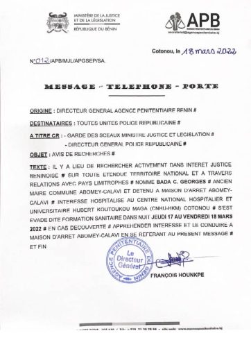 A travers un avis de recherche en date du vendredi 18 mars 2022, François Hounkpe, directeur général de l’Agence Pénitentiaire du Bénin (APB), informe que Georges BADA est activement recherché dans l’intérêt de la justice sur tout l’étendu du territoire national et dans les pays limitrophes.