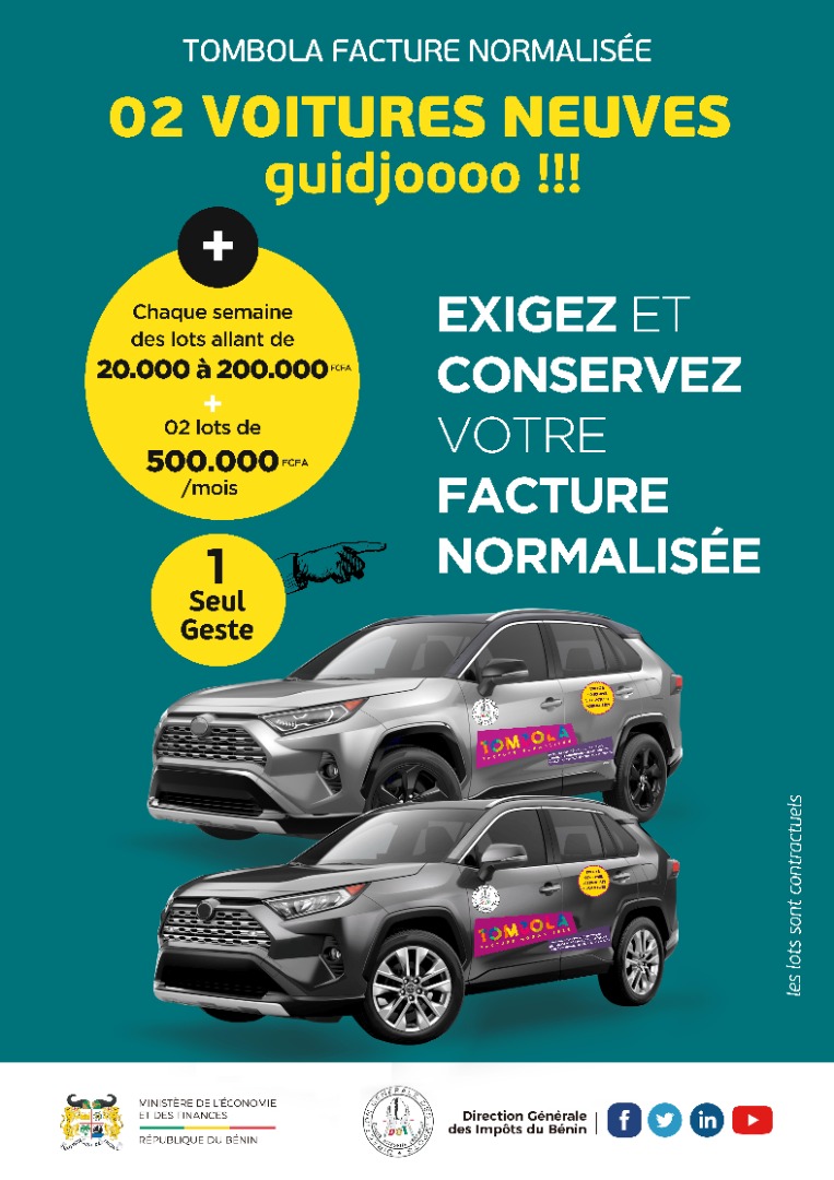 Dans le but de féliciter et d’encourager les populations de façon générale et particulièrement les consommateurs pour leurs contributions aux œuvres de construction et de développement du pays, la Direction générale des impôts du Bénin a initié, le jeu Tombola des factures normalisées. Plusieurs lots sont en jeu notamment deux voitures neuves de marque Toyota Rav4 et des sommes d’argent à gagner chaque vendredi.